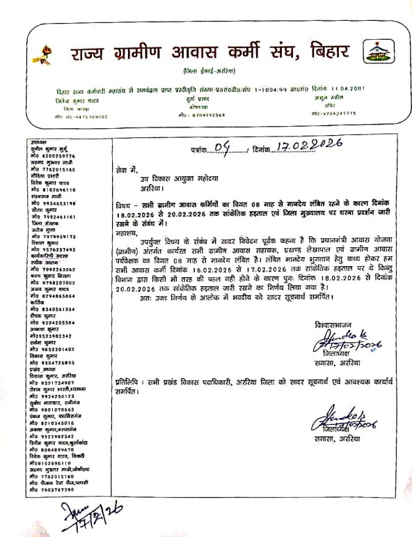 अररिया: सरकार की महत्वाकांक्षी योजना प्रधानमंत्री आवास योजना (ग्रामीण) को धरातल पर उतारने वाले आवास सहायक इन दिनों अपने ही अधिकारों के लिए संघर्ष कर रहे हैं। आठ माह से मानदेय भुगतान लंबित रहने और मानदेय पुनरीक्षण की मांग को लेकर राज्य ग्रामीण आवास कर्मी संघ के बैनर तले दूसरे दिन भी कलेक्ट्रेट परिसर में धरना जारी रहा।