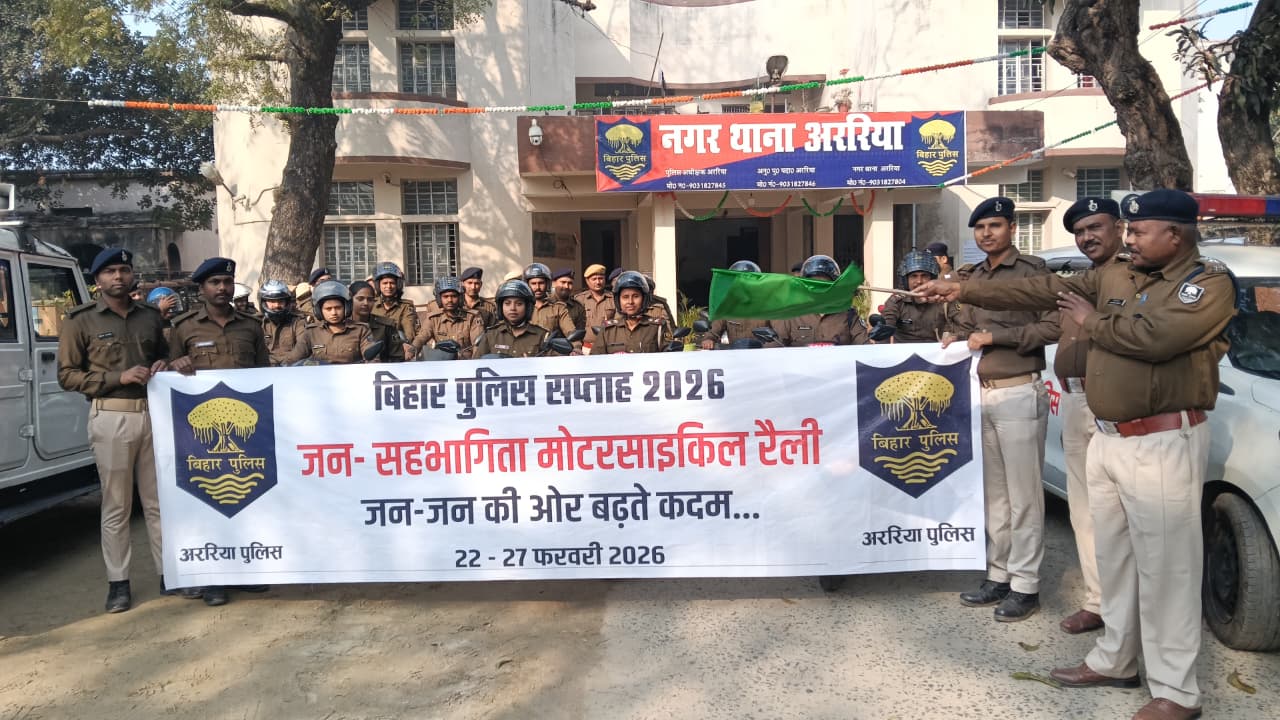 अररिया। बिहार_पुलिस_सप्ताह_2026 के प्रथम दिन जिले में उत्साहपूर्ण माहौल के बीच जन-सहभागिता मोटरसाइकिल रैली निकाली गई। नगर थाना से शुरू हुई यह रैली चांदनी चौक, जीरो माइल और बस स्टैंड होते हुए पुनः नगर थाना परिसर में आकर संपन्न हुई। रैली का नेतृत्व रक्षित डीएसपी सुधीर कुमार ने किया।